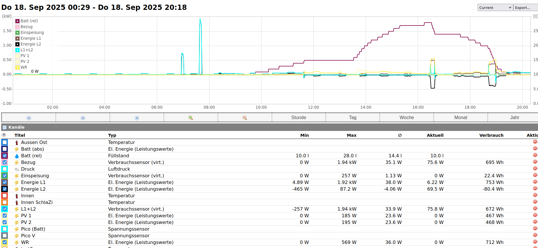 Das Ganze wird nun in VZ integriert, indem der vzlogger ein Meter periodisch ausführt, was per „exec“ ein Script mit mosquitto_sub und pub ausführt, damit ein Kommando „status“ absetzt und die dazu passende Antwort auswertet. Diese wiederum enthält alle verfügbaren Metriken, die dann wie üblich als VZ channel zur middleware gesendet werden. Damit bekommen wir schon mal eine schöne graphische Darstellung.